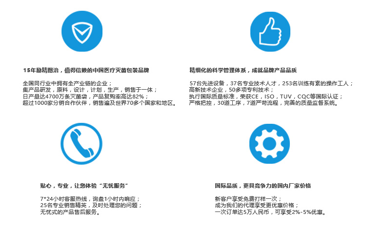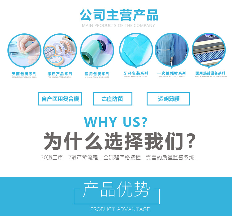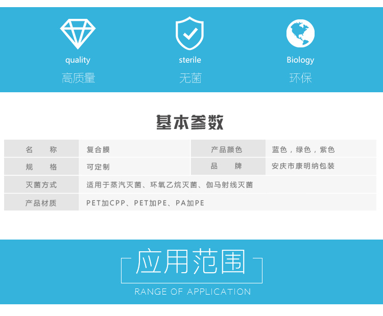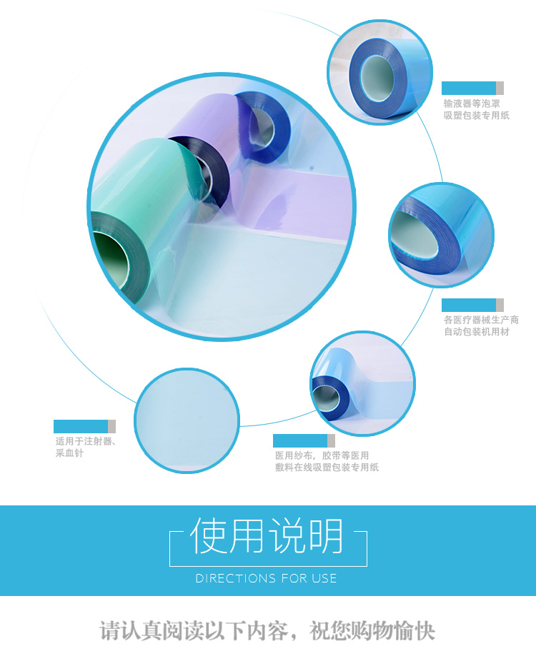 应用范围:医院、门诊灭菌包装;实验室用品的灭菌包装;适用于手套,纱布,棉球,口罩,导管,手术器材,牙科器材,注射器等医疗器械包装。