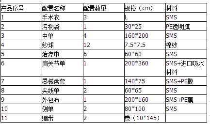 1、 集中性:该产品是将一系列手术中需要的手术单、包布、擦手纸、手术衣和纱布、盘、碗、杯等各种材料和工具集中于一个包装内,减少医疗机构手术材料的准备时间以及搜集各种材料的时间。