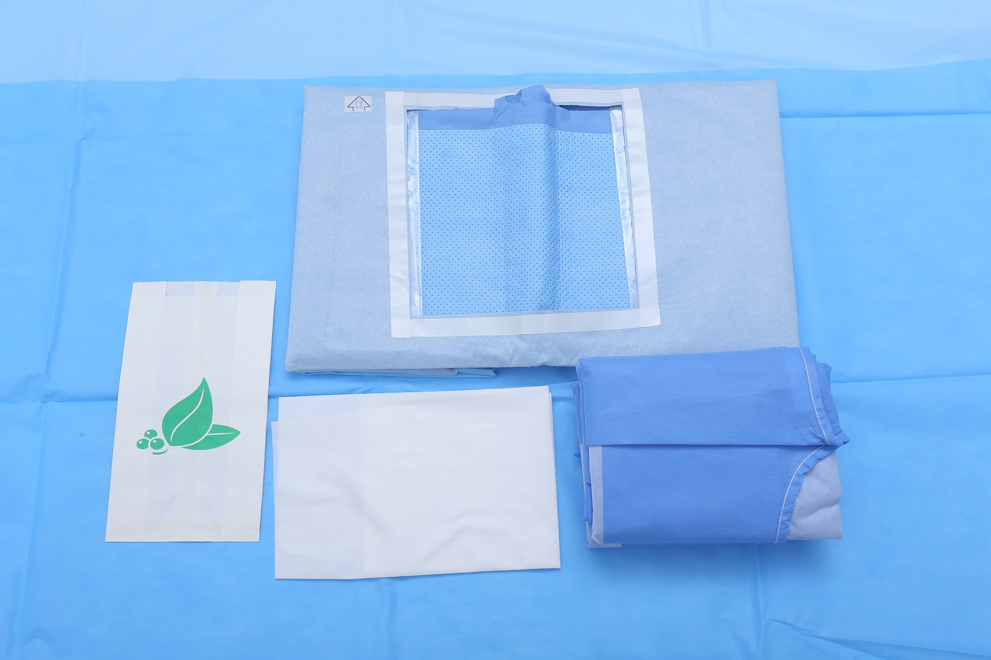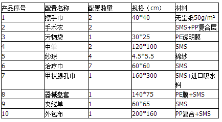 1、 集中性:该产品是将一系列手术中需要的手术单、包布、擦手纸、手术衣和纱布、盘、碗、杯等各种材料和工具集中于一个包装内,减少医疗机构手术材料的准备时间以及搜集各种材料的时间。