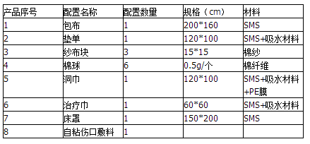 1、 集中性:该产品是将一系列手术中需要的手术单、包布、擦手纸、手术衣和纱布、盘、碗、杯等各种材料和工具集中于一个包装内,减少医疗机构手术材料的准备时间以及搜集各种材料的时间。