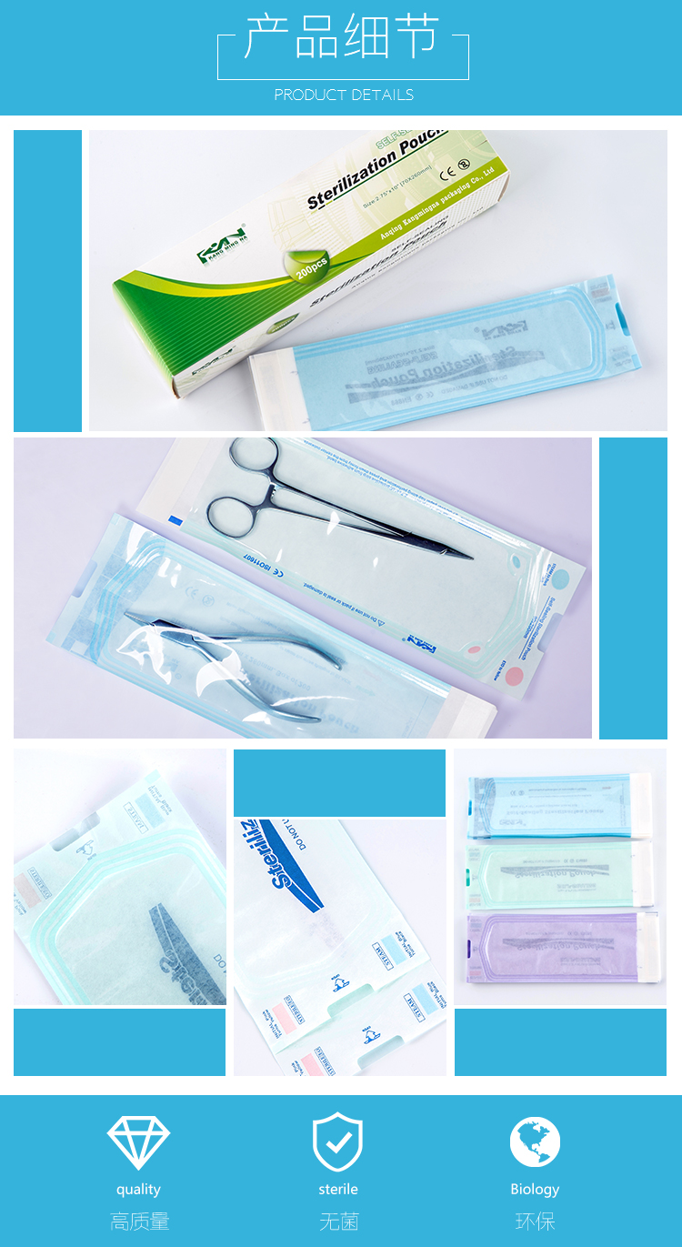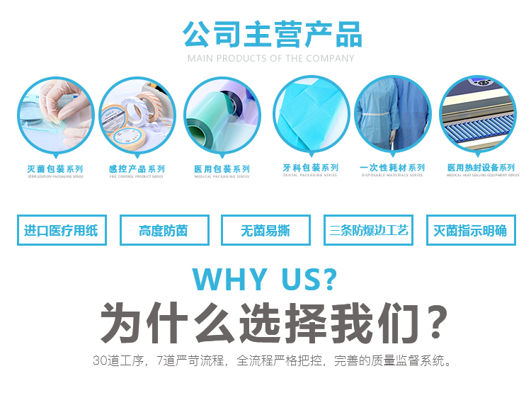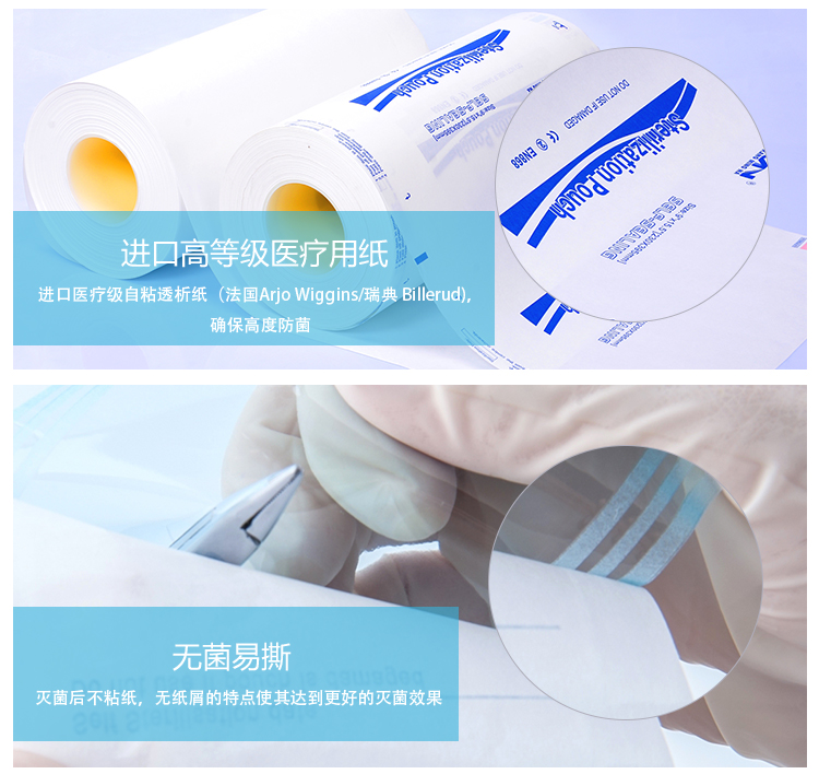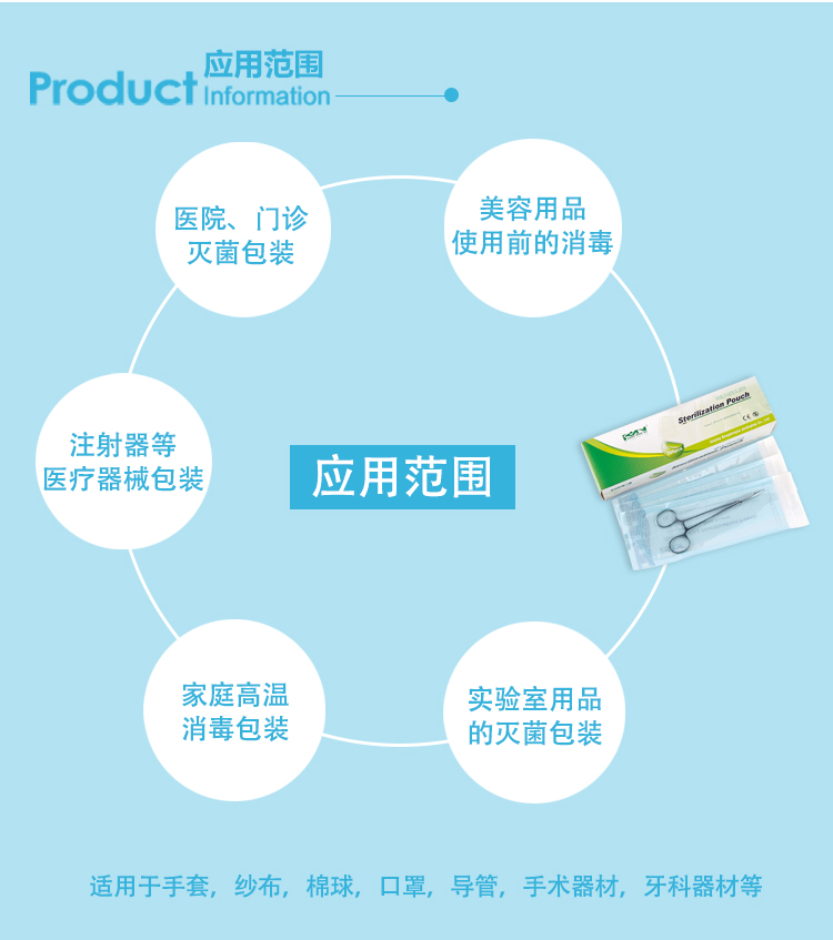 应用范围:医院、门诊;美容用品;实验室用品;家庭高温。适用于手套,纱布,棉球,口罩,导管,手术器材,牙科器材,注射器等包装。