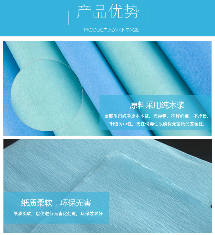 – 一次性医用皱纹纸由纯木浆构成特殊的多孔排列,可以使用高压蒸汽,环氧乙烷等介质弯曲地渗透到包内,穿透率达到100%,有实验证明有极好的阻菌效果。