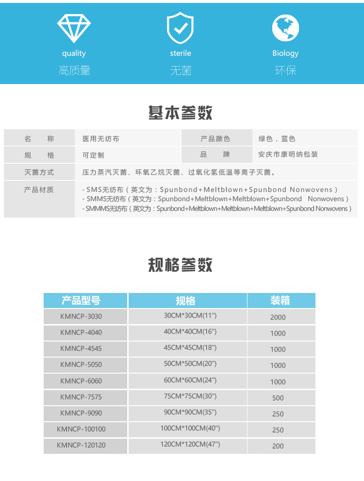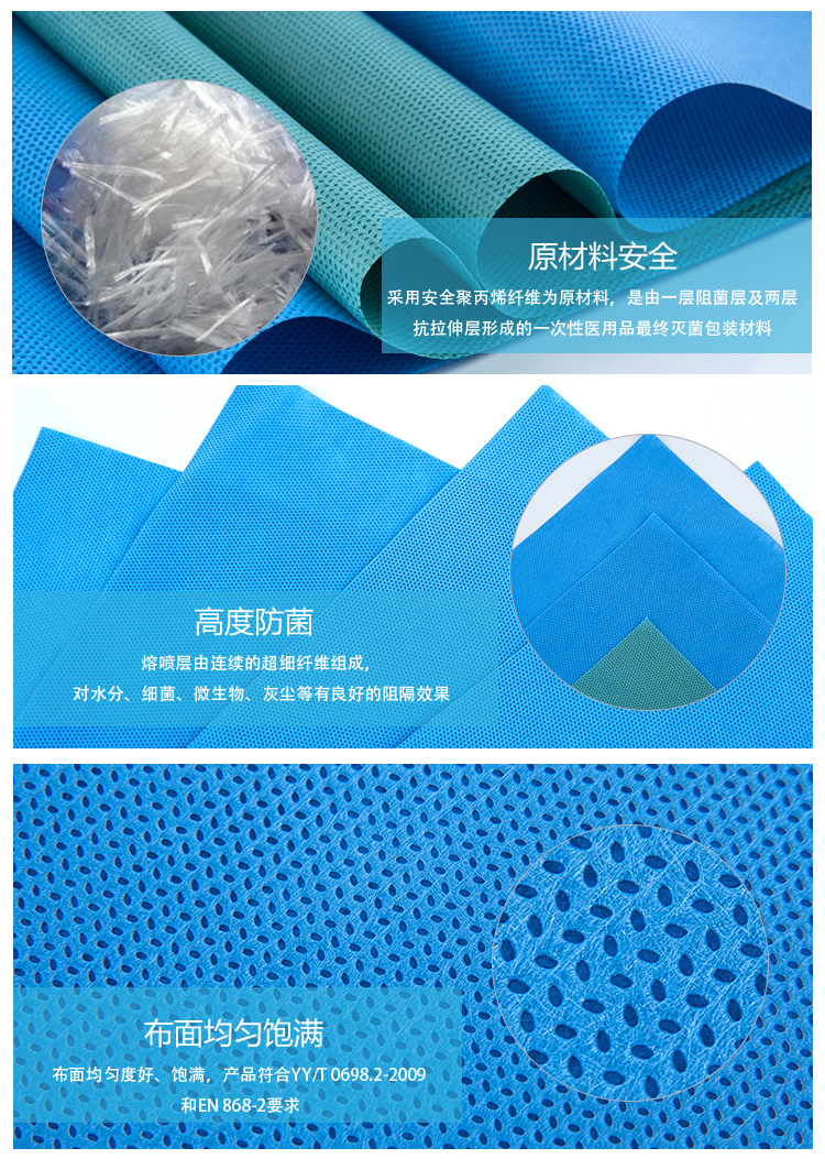 SMS, SMMS和SMMMS都属于复合无纺布,它是纺粘和熔喷的复合产品。完全采用100%安全聚丙烯纤维为原材料,是由一层阻菌层及两层抗拉伸层形成的一次性医用品最终灭菌包装材料。无毒性、无纤维脱落,有效阻菌率高;布面均匀度好、饱满,产品符合YY/T 0698.2-2009 和EN 868-2要求,具有阻菌、防静电、抗拉伸等特点。SMMS涵盖了SMS的所有性能,并在SMS的性能极大的扩展:隔菌、静水压、强度、均匀性、柔软性、应用领域。SMMMS可以替代纯棉织物面料、手感柔软、细腻、亲肤性优良。纺粘层由连续长丝组成,有很好的断裂强度和伸长率。熔喷层由连续的超细纤维组成,对水分、细菌、灰尘等有良好的阻隔效果。有很高的耐水压和良好的透气性,良好的耐酸、耐碱能力。