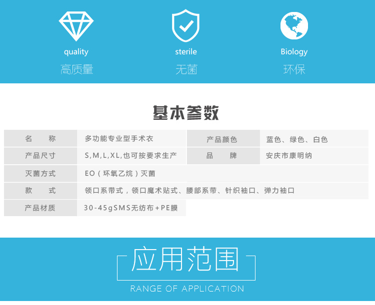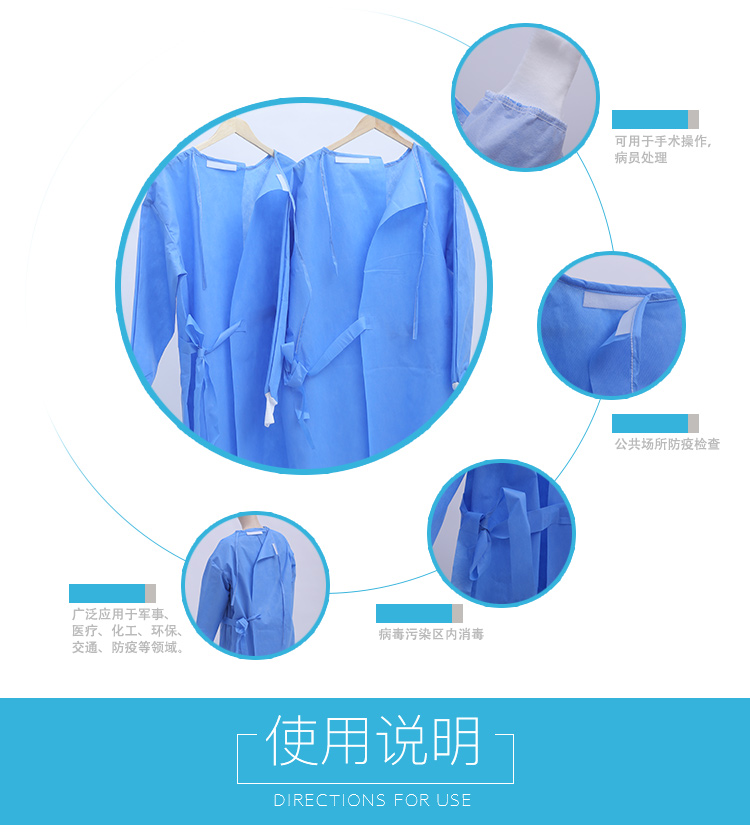 产品尺寸:S,M,L,XL型手术衣,也可按要求生产