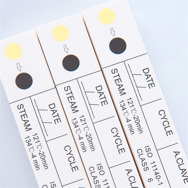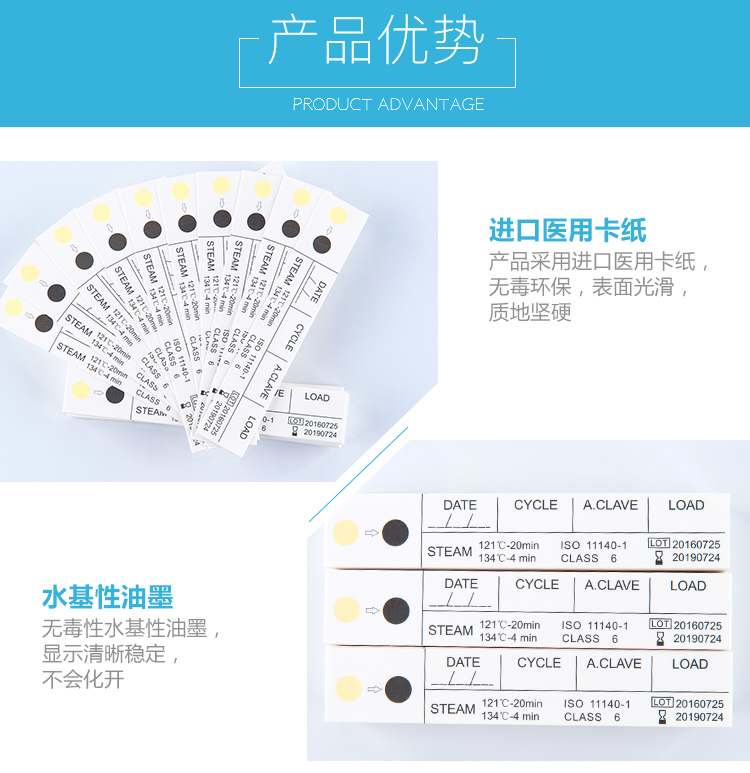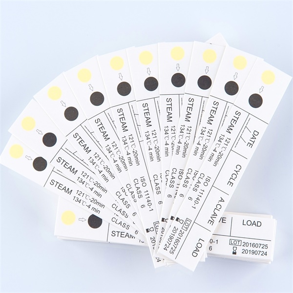 产品将化学物质与显色剂及其辅料制成油墨并将油墨印制在特殊卡纸上,显示指示色块在适当的温度、湿度、压力的情况下能快捷直观地反映出被灭菌物品是否经过灭菌处理,灭菌后的颜色不易褪色