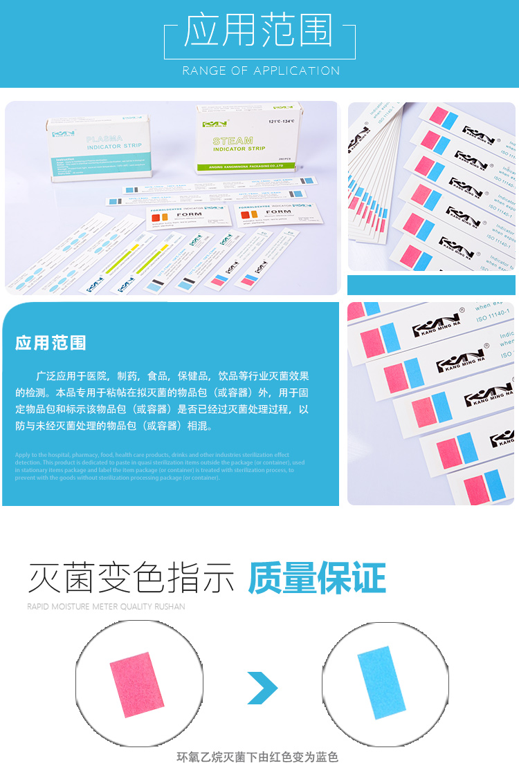 应用范围:广泛应用于医院,制药,食品,保健品,饮品等行业的检测。本品专用于粘帖在拟灭菌的物品包(或容器)外,用于固定物品包和标示该物品包(或容器)是否已经过灭菌处理过程。