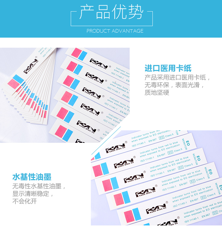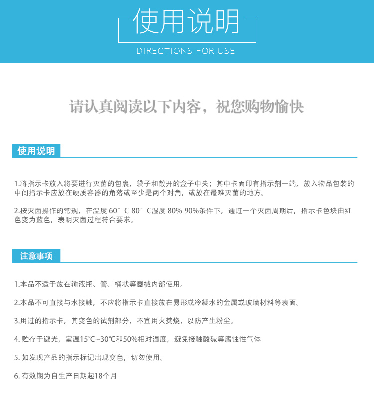 【使用方法】:撕揭一条指示标签,贴于待灭菌包表面,然后,进行常规处理。完毕后将包裹取出,观察表面指示剂变化。如果指示剂颜色变成蓝色,表明此包裹已经过灭菌处理;