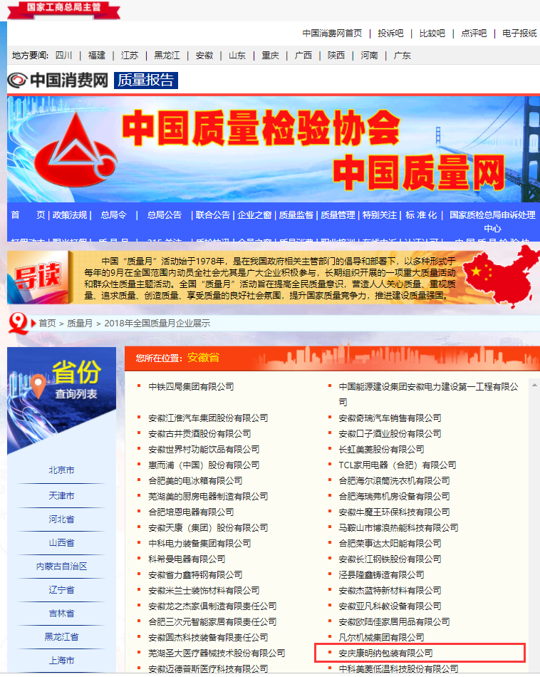 - 为促进质量强国建设,国家市场监督管理总局联合中共中央宣传部、国家发展和改革委员会、工业和信息化部等34个相关部门、行业协会共同在2018年9月开展主题为“加强市场监管,建设质量强国”的2018年全国“质量月”活动。 以生产制作医疗灭菌包装,化学指示胶带及医用无纺布和医用皱纹纸等主要产品的安庆市康明纳包装有限公司以其优质的产品质量和良好的市场口碑荣登"全国质量月"活动企业品牌板
